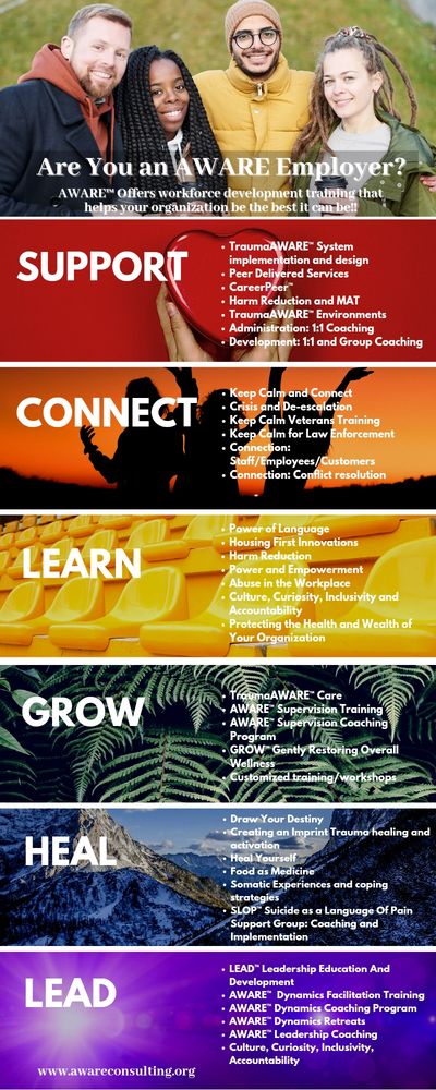 AWARE offers workforce development and training options to help organizations be the best they can be. We provide the tools needed to build and establish nurturing relationships, connect communities, and maintain health and wellness for all.